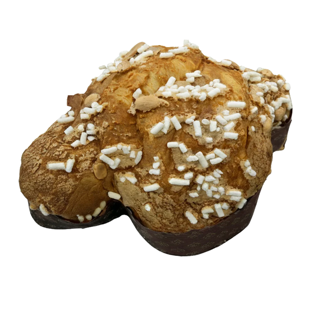 In superficie, una glassa croccante e squisita alla mandorla sigilla il tutto, arricchita da mandorle grezze intere e granella di zucchero, per un piacevole contrasto.