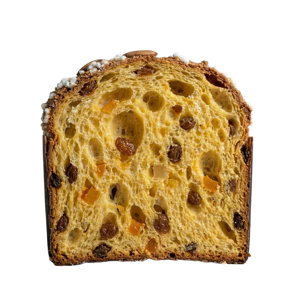 L’Essenza degli Ingredienti: Al taglio, la perfetta alveolatura rivela ingredienti d’eccellenza: preziosi cubetti di arancia candita calabrese e la pregiata uva sultanina “Sei Corone”. Questi si fondono armoniosamente con i sentori avvolgenti di burro fresco e pura vaniglia Bourbon.